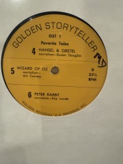 Golden Storyteller – Favorite Tales (Golden Records GST-1), 12? 33? RPM LP with classic narrated children’s stories on bright yellow labels. Includes: “The Three Bears,” “Thumbelina” (Rita Golden), “Smokey the Bear” (Frank Milano & Kay Lande), “Hansel & Gretel” (Susan Douglas), “Wizard of Oz” (Art Carney), and “Peter Rabbit” (Kay Lande). A.A. Records, Inc. — charming vintage storytime listen. Condition: Good play copy with typical shelf/handling wear.